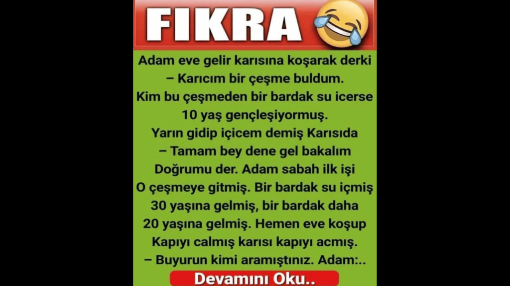 Adam sabah ilk işi o çeşmeye gitmiş. Bir bardak su içmiş 30 yaşına gelmiş bir bardak daha 20 yaşına gelmiş. Hemen eve koşup kapıyı çalmış karısı kapıyı açmış ve