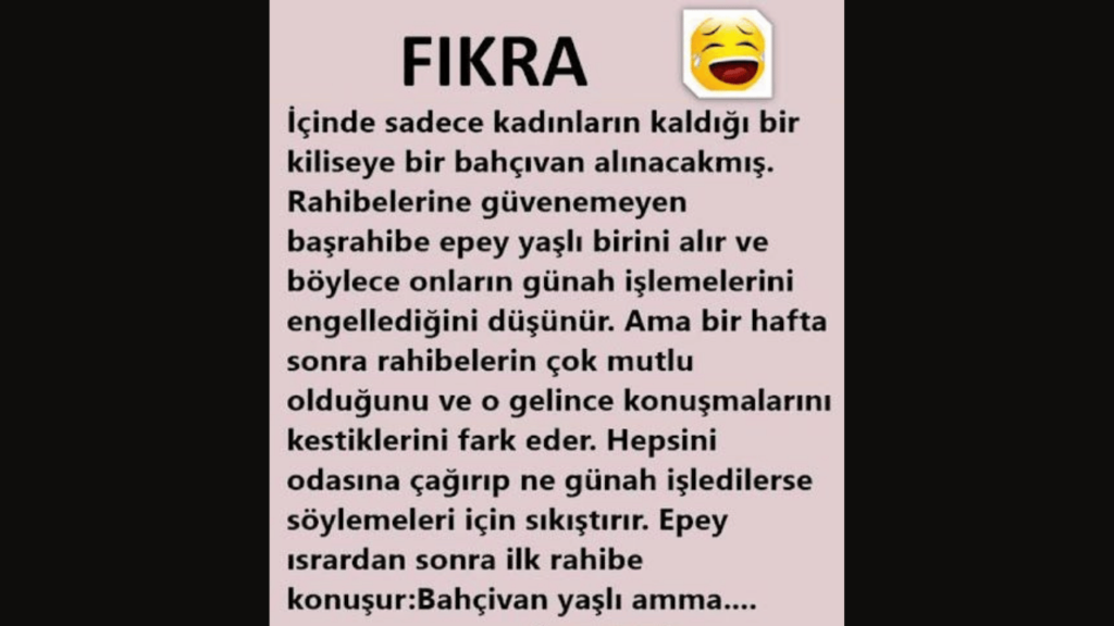 Oldukça komik bir fıkra mutlaka okuyunuz! İçinde sadece kadınların kaldığı bir kiliseye bir bahçıvan alınacakmış. Rahibelerine güvenemeyen başrahibe epey yaşlı birini alır ve böylece onların günah işlemelerini engellediğini düşünür. Ama bir hafta sonra rahibelerin çok mutlu olduğunu ve o gelince konuşmalarını kestiklerini fark eder. Hepsini odasına çağırıp ne günah işledilerse söylemeleri için sıkıştırır. Epey ısrardan sonra ilk rahibe konuşur: