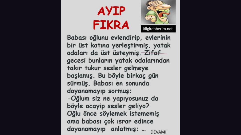 Babası oğlunu evlendirip, evlerinin bir üst katına yerleştirmiş. Yatak odaları da üst üsteymiş. Zif-faf gecesi bunların yatak odalarından takır tukur sesler gelmeye başlamış. Bu durum böyle birkaç gün sürmüş.